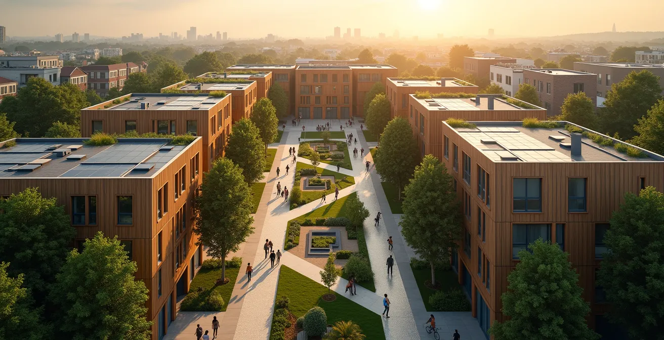 Face à l’urgence climatique et à la crise du logement, l’idée de construire des quartiers plus verts s’impose. On imagine spontanément des toits végétalisés, des pistes cyclables omniprésentes et des panneaux solaires scintillant au soleil. Ces éléments, bien que pertinents, ne sont que la partie visible d’une transformation beaucoup plus profonde. Le risque est de tomber dans le piège de l’écologie de façade, une collection d’initiatives déconnectées qui rassurent la conscience sans véritablement changer la donne.